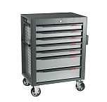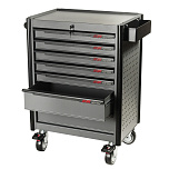 7 ящиков. Оборудована большой прочной пластиковой ручкой. Перфорированные боковые стенки с квадратными отверстиями предоставляют возможность разместить дополнительные аксессуары для хранения инструментов. Роликовые направляющие с функцией автоматического возврата обеспечивают плавность открывания/закрывания секций. Колеса из термопластичного каучука, обеспечивают легкое и бесшумное перемещение тележки. Наличие центрального замка