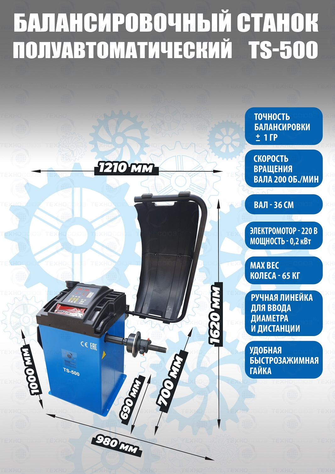 + TS-500 Балансировочный станок для колес легковых автомобилей, мотоциклов и легких грузовиков. В комплекте: кожух с автозапуском + клещи + кронциркуль + быстрозажимная гайка + набор конусов. Для балансировки для колес легковых автомобилей, мотоциклов и легких грузовиков с диаметром диска с резиной до 760 мм. Размеры диска: ширина 3–9” (76-228 мм) , диаметр диска" -  10–21” (254-533 мм). Вал-36 мм. Максимальный вес колеса с диском – 65 кг. Точность ±1гр. Напряжение 220В. C кожухом.  Напряжение 220В. позволяет производить шиномонтаж и балансировку колес. Данные станки возим более 10 лет. Надежные - не подведут в сезон!!!  Напряжение шиномонтажных станков 220В или 380В на выбор.