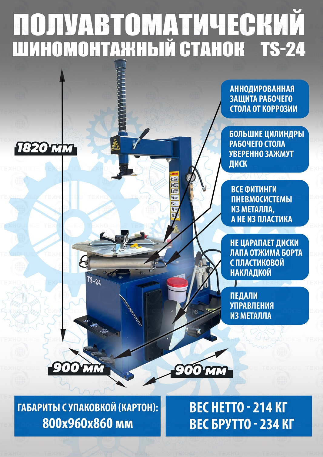 шиномонтажного станка TS-24. Полуавтоматический. Квадратный стол. Для дисков:11÷24”. Усилие отрыва покрышки 2700 кг. В комплекте: пистолет с манометром для подкачки шин + монтажка + пластиковые накладки на зажимные кулачки + регулятор давления с влагоотделителем и манометром