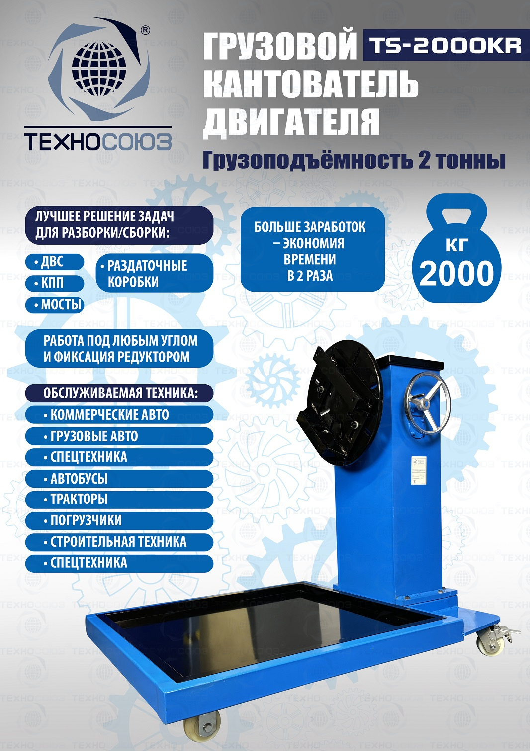 Оснащен редуктором для легкого вращения одной рукой. Редуктор позволяет поворачивать вывешенный двигатель на 360°. Надежная сварная конструкция и 4 колеса обеспечивают маневренность и устойчивость к перевороту. В комплекте поддон для сбора отработанного масла. С универсальным кронштейном для удобства вывешивания и обслуживания ДВС грузовиков. Для сборки/разборки моторов V6, V8 и V12. г/п: 2000 кг.