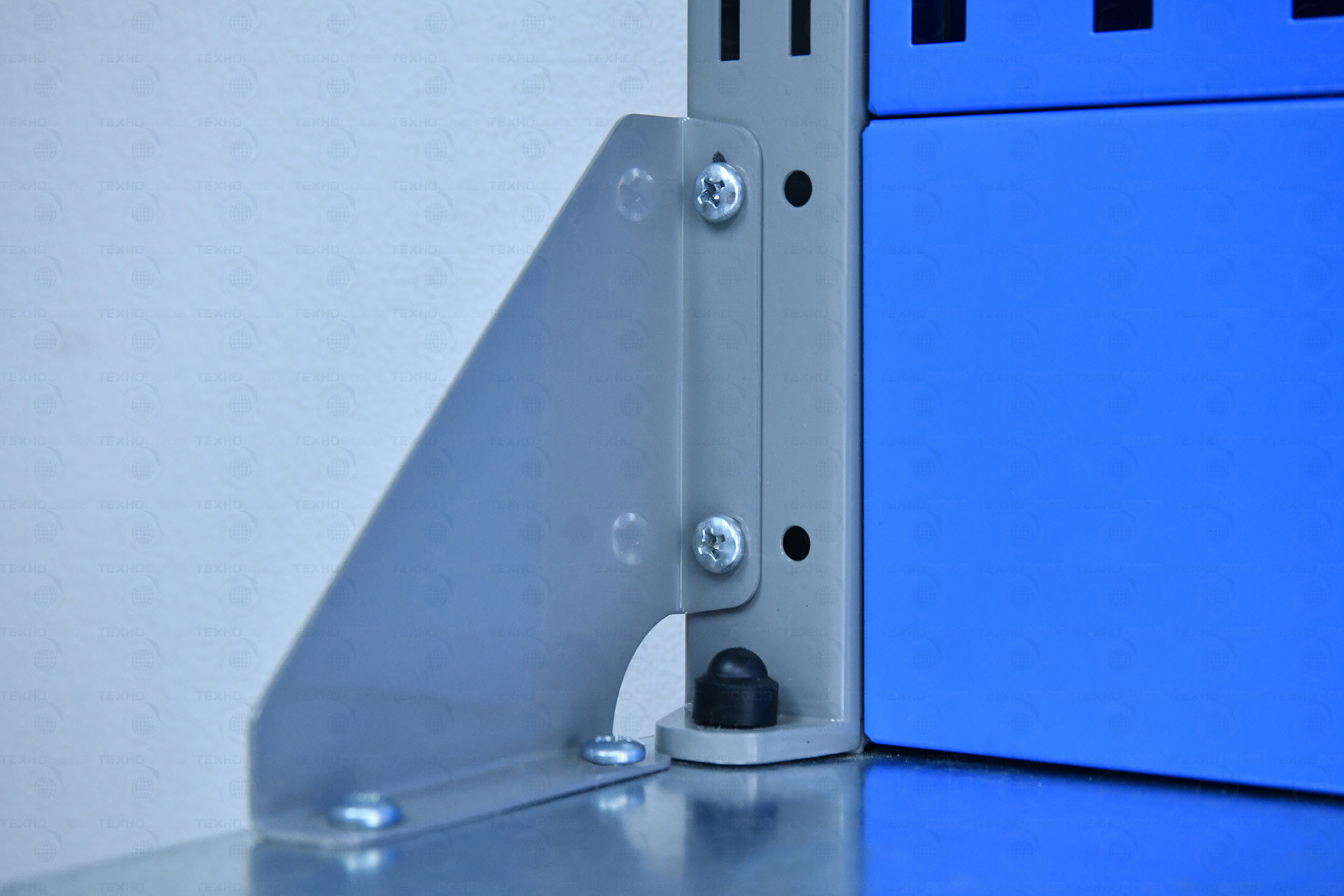 Опорные элементы выполнены сварными из холоднокатаной стали. Верстак комплектуется полкой-стенкой, расположенной под столешницей для удобного размещения габаритного инструмента и оснастки. Все металлические элементы покрыты полиэфирной порошковой краской, обеспечивающей хорошую износостойкость покрытия и невосприимчивость его к моющим средствам и смазочным веществам. Цвет и текстура покрытия корпуса тумб, опор, полки-стенки, экранов и комплектов освещения RAL 5015, гладкая, полуматовая. Цвет и текстура покрытия ящиков и дверок верстака, кронштейнов экранов и косынок RAL 7037, гладкая, глянцевая. Цвет и текстура покрытия накладок ручек ящиков и дверок RAL 9006, гладкая, глянцевая.