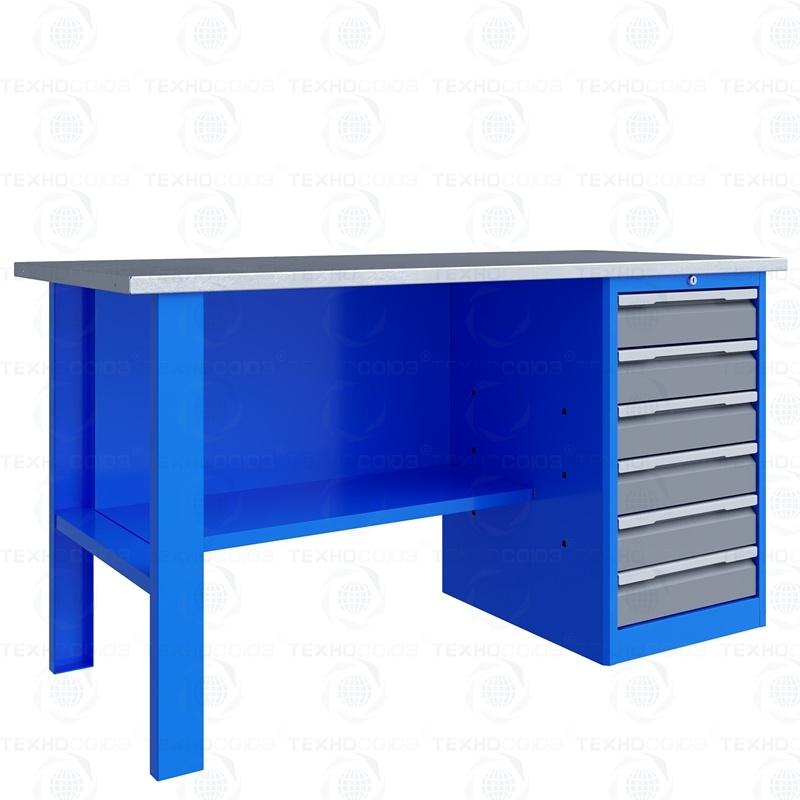 Однотумбовый. Допустимая нагрузка на столешницу 750 кг. Опорные элементы выполнены сварными из холоднокатаной стали. Для выполнения сборочных, ремонтных, слесарных, монтажных и других видов работ на производстве, в сервисных центрах, мастерских, гаражах, а также для обучения технологии в учебных заведениях. Комплектуется полкой-стенкой, расположенной под столешницей для удобного размещения габаритного инструмента и оснастки. Размеры верстака: 855x1596x696 мм. Вес: 88 кг. Поставляется в 4 комплектациях на выбор.